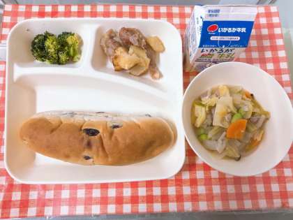 【鶏肉とじゃがいものガーリック焼き、スープ煮、ブロッコリーのサラダ、レーズンパン、牛乳】