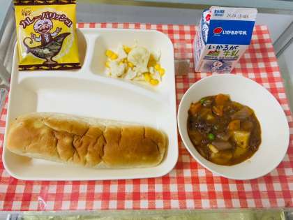 【ビーフシチュー、カリフラワーとコーンのサラダ、カレーフィッシュ、おさつパン、牛乳】