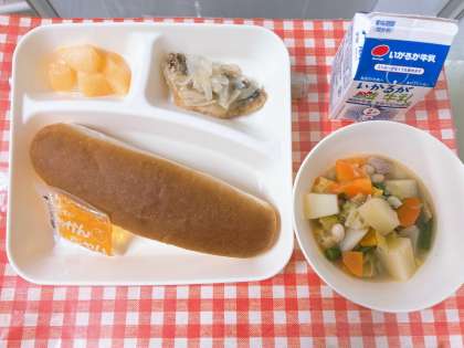 【あじのレモンマリネ、てぼ豆のスープ煮、白桃(缶づめ)、コッペパン、みかんジャム、牛乳】