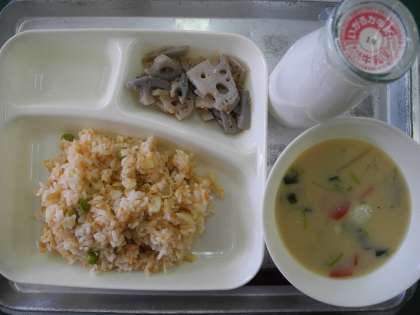 さけちらし、雑煮、れんこんのごま醤油焼き、牛乳でした。雑煮には、白玉もちをはじめ、金時にんじん、大根、鶏肉、みつばが入っていて、栄養たっぷり、とてもおいしかったです!