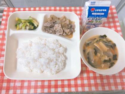 【豚肉のごまだれ焼き、みそ汁、きくなとはくさいのおひたし、ごはん、牛乳】