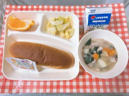 2月10日 【鶏肉とほうれんそうのシチュー、キャベツのサラダ、デコポン、コッペパン、アプリコットジャム、牛乳】