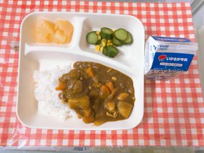 【2月21日 チキンレバーカレーライス、きゅうりとコーンのサラダ、洋なし(缶づめ)、牛乳】