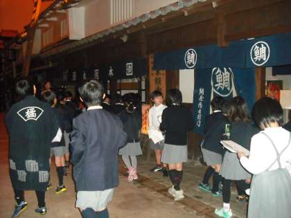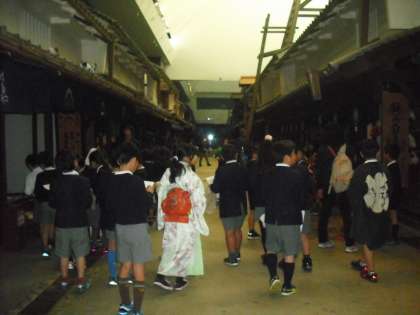 その後は、江戸時代の町並みを再現しているところを見学しました。昔の本屋さんや呉服屋さん、井戸やトイレなど、今ではなかなか見られないものを見たり触れたり、みんな興味津々でした。見学の時間もあっという間に終わってしまい、天満の商店街の様子を見ながら学校へ戻りました。