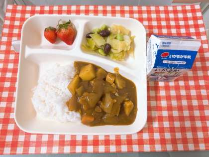 【チキンカレーライス、ビーンズサラダ、いちご、牛乳】