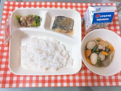 【さごしのおろしじょうゆかけ、さといもと野菜の含め煮、なのはなのおひたし、ごはん、牛乳】