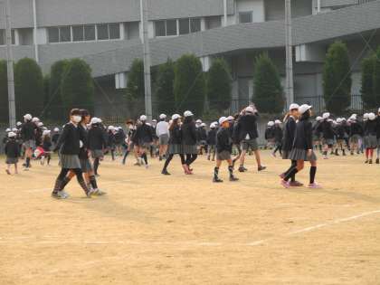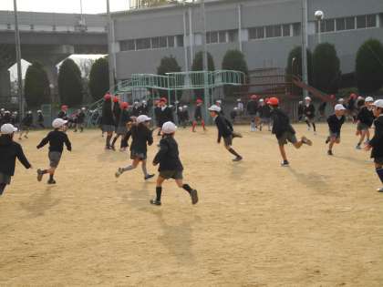 おには帽子を赤に、逃げる子は白にしました。おににタッチされたら、帽子を赤にし、どんどんおにが増えていくという遊びです。