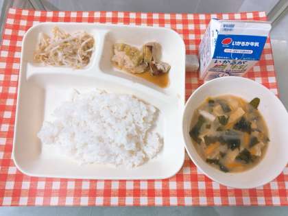 【焼きとり、みそ汁、もやしのゆずの香あえ、ごはん、牛乳】