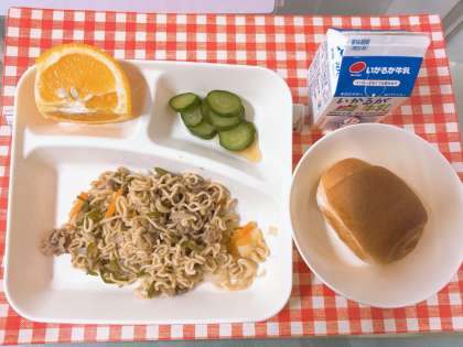 【焼きそば、きゅうりのしょうがづけ、あまなつかん、ミニコッペパン、牛乳】