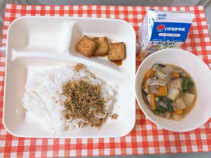 【鶏肉とじゃがいもの煮もの、あつあげのしょうゆだれかけ、紅ざけそぼろ、ごはん、牛乳】