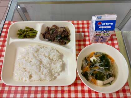【プルコギ、とうふとわかめのスープ、さんどまめのナムル、ごはん、牛乳】