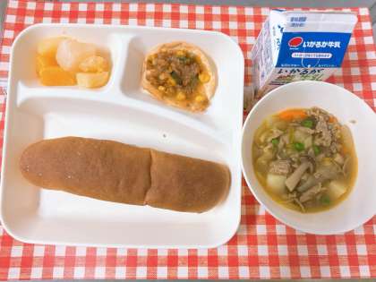 【豚肉と野菜のカレースープ煮、変わりピザ、ミックスフルーツ(缶づめ)、レーズンパン、牛乳】