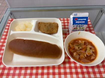 【トンカツ、ミネストローネ、和なし(カット缶)、黒糖パン、牛乳】