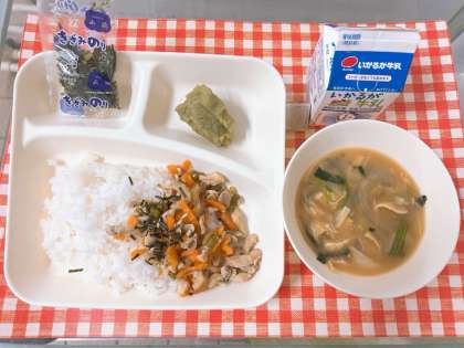 【かやくごはん(きざみのり)、みそ汁、まっ茶ういろう、牛乳】
