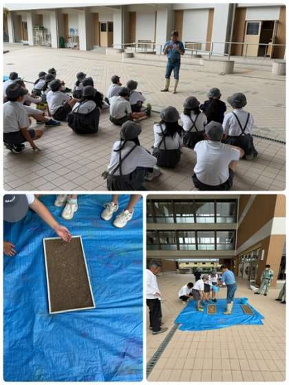 今日は地域の方にお越しいただき、米づくり体験の1回目「もみまき」を行いました。