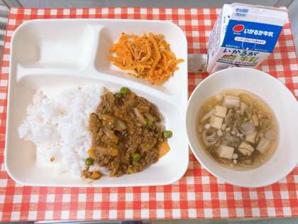 【タコライス、とうふともずくのとろり汁、にんじんしりしり風、牛乳】