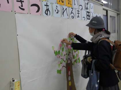 児童会が新たな取り組みをしています。自分からあいさつをした子には「花びら」を、あいさつを返せた子には「葉っぱ」を手渡しました。そして、職員室前掲示板の木に「花びら」と「葉っぱ」を貼り付けていきます。