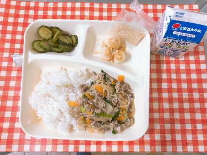 【豚丼、きゅうりのかつお梅風味、白玉だんご(きな粉)、牛乳】