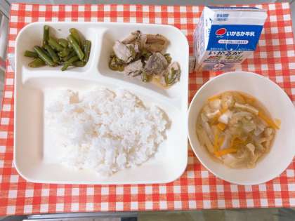 【豚肉の梅風味焼き、五目汁、さんどまめのごまあえ、ごはん、牛乳】