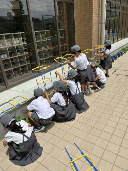 今日は、生活科で育てているあかざおに支柱をたてました。