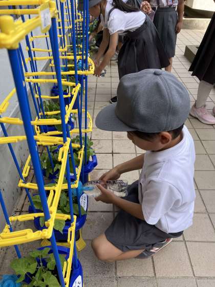 肥料をあげながら、「何色の花が咲くの?」「いつ咲くの?」と声をかけていて、お花が咲くのが待ち遠しい様子でした。