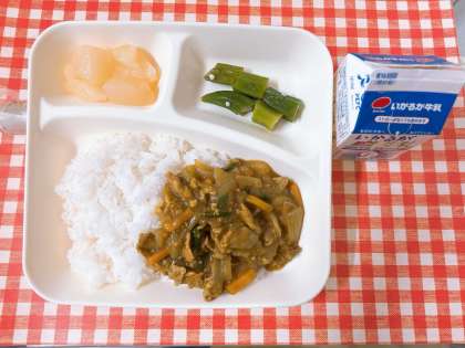【和風カレー丼、オクラの甘酢あえ、和なし(缶づめ)、牛乳】