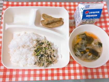 【6/25 いわしてんぷら、五目汁、とりなっ葉いため、ごはん、牛乳】