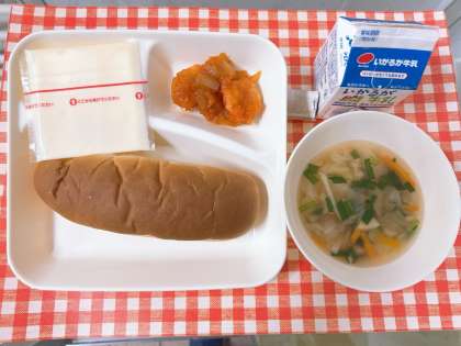 【6月30日(月)えびのチリソース、中華スープ、スライスチーズ、黒糖パン、牛乳】
