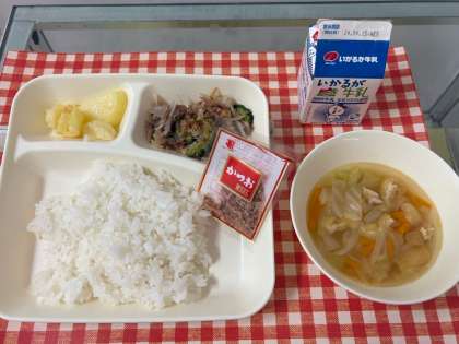 【7月1日(火)ゴーヤチャンプルー(かつおぶし)、五目汁、焼きじゃが、ごはん、牛乳】