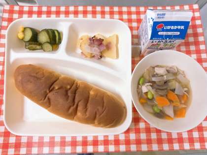 【鶏肉と野菜のスープ煮、ジャーマンポテト、きゅうりとコーンのサラダ、おさつパン、牛乳】