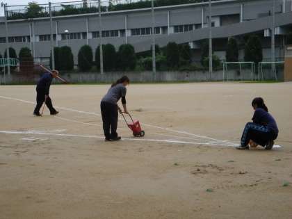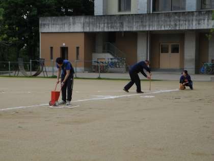 明日は晴れるようなので、放課後、運動場にソフトボール投げのラインを引きました。