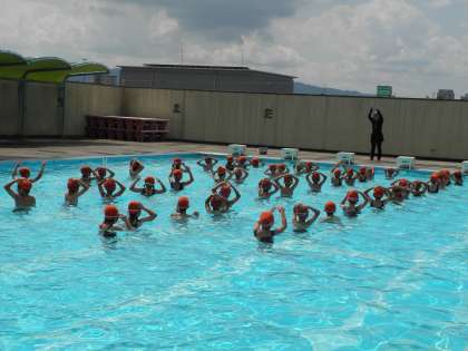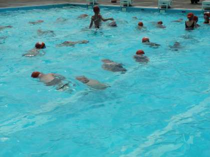 プールに入って、先生の指示があるまでは両手を頭の上に置きます。初めに、CDの音楽に合わせて、プールの中でダンスをしました。それから、だるま浮き、やあめんぼなど、水慣れをしました。