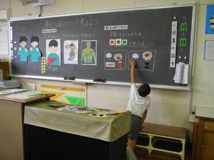 題材は、「朝ごはんについて考えよう」です。朝ごはんのはたらきには、「頭のスイッチ」「おなかのスイッチ」「体のスイッチ」があります。朝ごはんの大切さを教えていただきました。