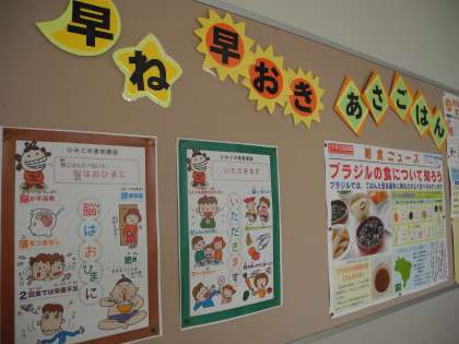 給食室前の掲示板です。 休み時間には、立ち止まって読んでいる子どもの姿が見られます。