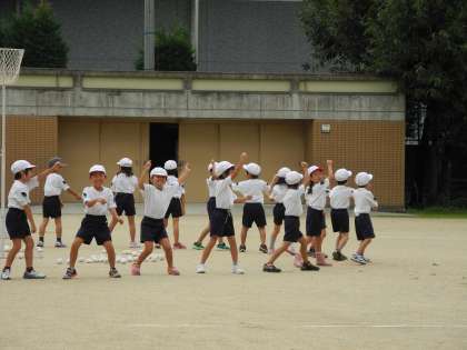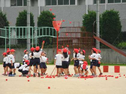1年生は、団体競技「玉入れ」の練習をしました。途中、音楽に合わせて、ダンスをします。