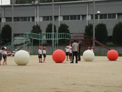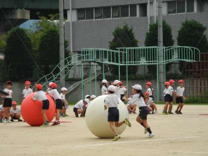 2年生は、団体競技「大玉ころがし」の練習をしました。大きな玉を二人で協力して転がすのですが、上手に転がすのはなかなか難しそうです。