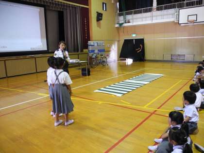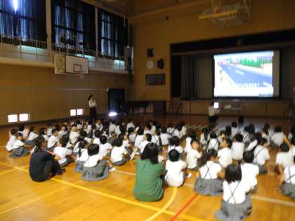 低学年は、横断歩道の渡り方などの歩行者の心得について学習しました。DVDを見た後、代表の児童が正しい横断歩道の渡り方を実演して、楽しく学習できました。