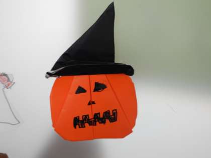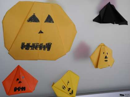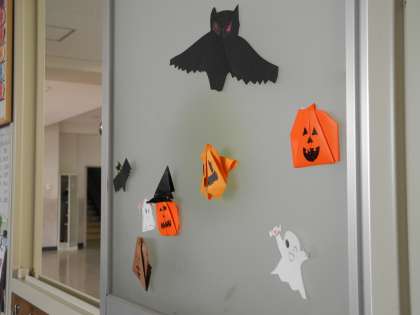2年生の教室の窓です。折り紙で作ったハロウィンの飾りは、とてもかわいいです。
