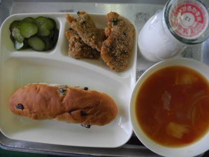 今日の給食の献立は、ミラノ風カツレツ、ミネストローネ、きゅうりのサラダ、レーズンパン、牛乳でした。ミラノ風カツレツの衣は、バジル、パセリ、塩、コショウで味付けしていたので、とてもおいしかったです。