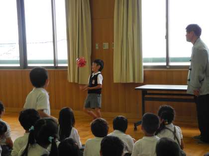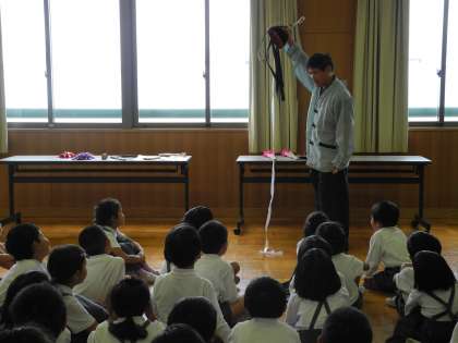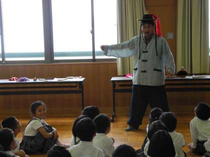 1年生は、韓国のあいさつや手遊びについて学びました。楽しそうな遊び道具に、子どもたちは興味津々でした。