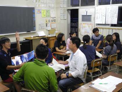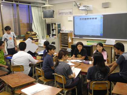 今回は、時間を設定して指導案に基づいて授業をしました。その様子をタブレットで撮影し、自己で振り返れるようにしました。その後、グループになって良かった点や改善点を話し合いました。