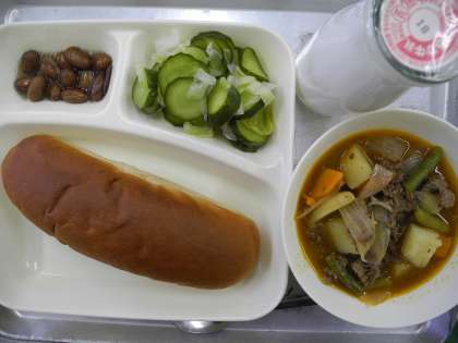 今日の給食の献立は、牛肉と野菜の洋風煮、キャベツときゅうりのサラダ、うずら豆のグラッセ、黒糖パン、牛乳でした。
