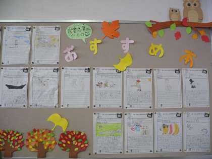 また、掲示板には、「おすすめの本」が紹介されたり、秋の飾りつけになったりしています。