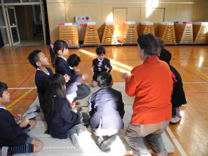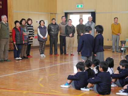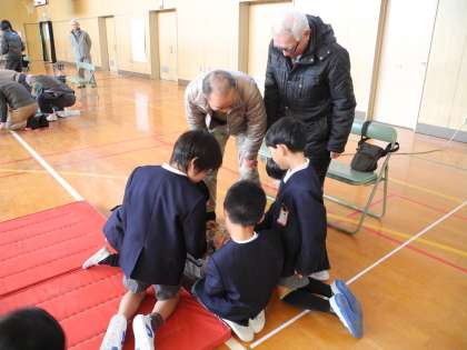 8つの遊び(めんこ、だるまおとし、あやとり、羽根つき、けん玉、コマ回し、おはじき、お手玉)のコーナーに分かれて、昔の遊びを経験しました。子どもたちも、地域の方々も、とても楽しそうでした。
