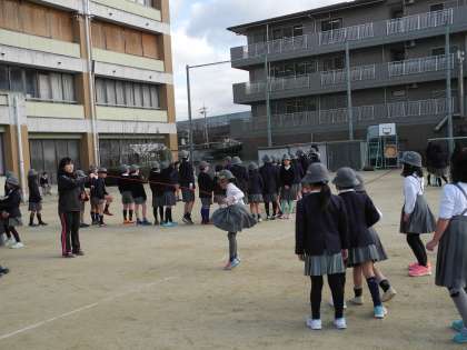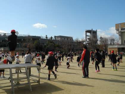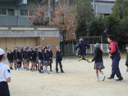 20分休みに、全員が運動場でなわとびをしました。前半は、個人でいろいろな跳び方を練習しました。後半は、クラスで大なわの8の字跳びをしました。