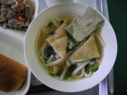 今日の給食の献立は、豚肉とゴボウの煮物、なにわうどん、キャベツと三度豆のごまあえ、黒糖パン、牛乳でした。