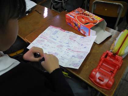 5年生は、理科「電磁石のはたらき」でモーターカーを作っています。プロジェクターを見て説明を聞きながら、組み立てています。