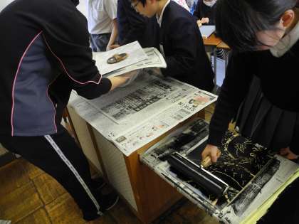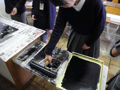 4年生は、木版画をしています。今日はインクをつけて刷る活動をしました。