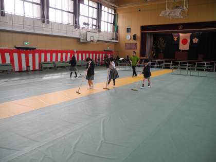 明日の入学式に向けて、新6年生と新2年生が登校しました。新6年生は、1年生の教室の飾りつけや講堂のそうじ、新2年生は、歓迎のことばの練習をしました。