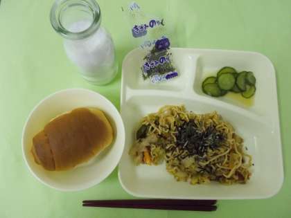 【ミニ黒糖パン、牛乳、焼きそば、きゅうりのしょうがづけ】